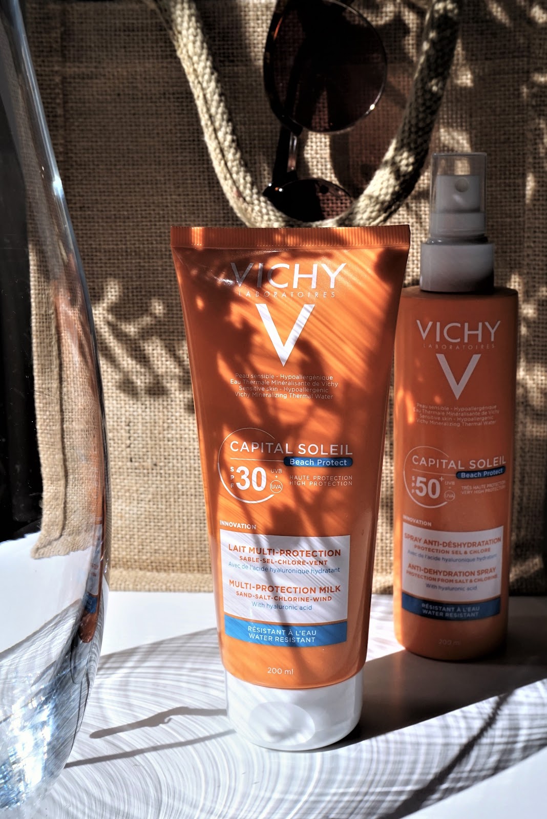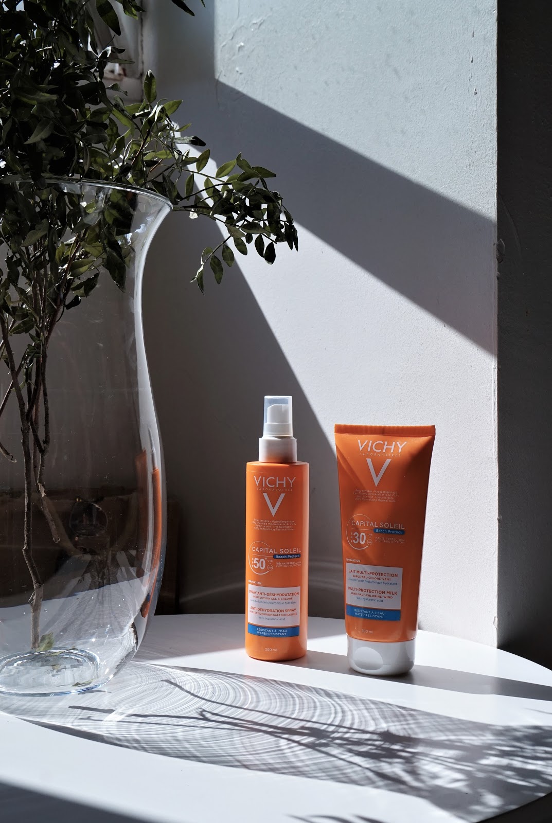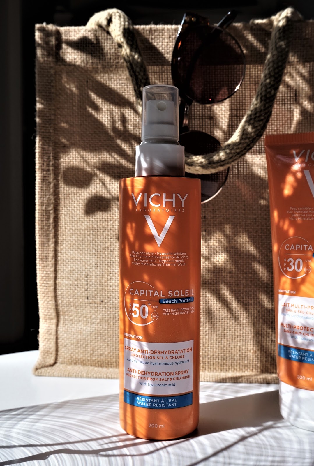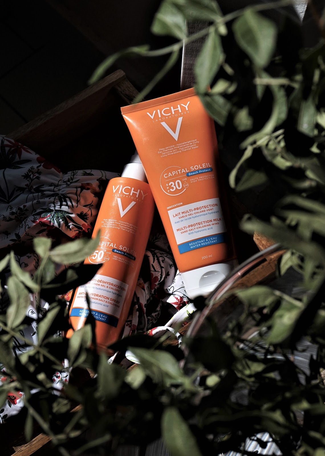 Grand marronnier, je vous présente les nouveautés de l’année en matière de protection solaire par Vichy. J’ai la chance de recevoir fréquemment leurs produits donc je ne connais pas la prise de tête devant les étales de produits solaires. L’année dernière je vous avais présenté de l’Eau de protection solaire qui reste à ce jour ma protection favorite. Si vous ne connaissez pas cette Eau. Cette année, Vichy nous propose dans sa gamme Capital Soleil Beach Protect un Lait Multi-protection SPF 50 et un Spray anti-déshydratation SPF 30 et SPF50+. Petite particularité cette année, les deux références sont formulées avec de l’acide hyaluronique, ingrédient très tendance en ce moment et pour cause celui-ci est très efficace pour assurer une belle hydratation de la peau. Entre les températures caniculaires de ce début d’été et ma prise d’antibiotiques – je suis toujours en guerre contre l’acné – photosensibilisants j’ai eu le temps de bien tester ces deux nouveautés pour vous donner mon avis.